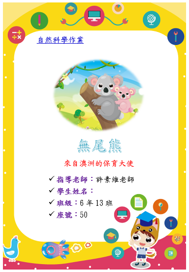 二、標題:無尾熊,標楷體,48;使用文字效果,p10。